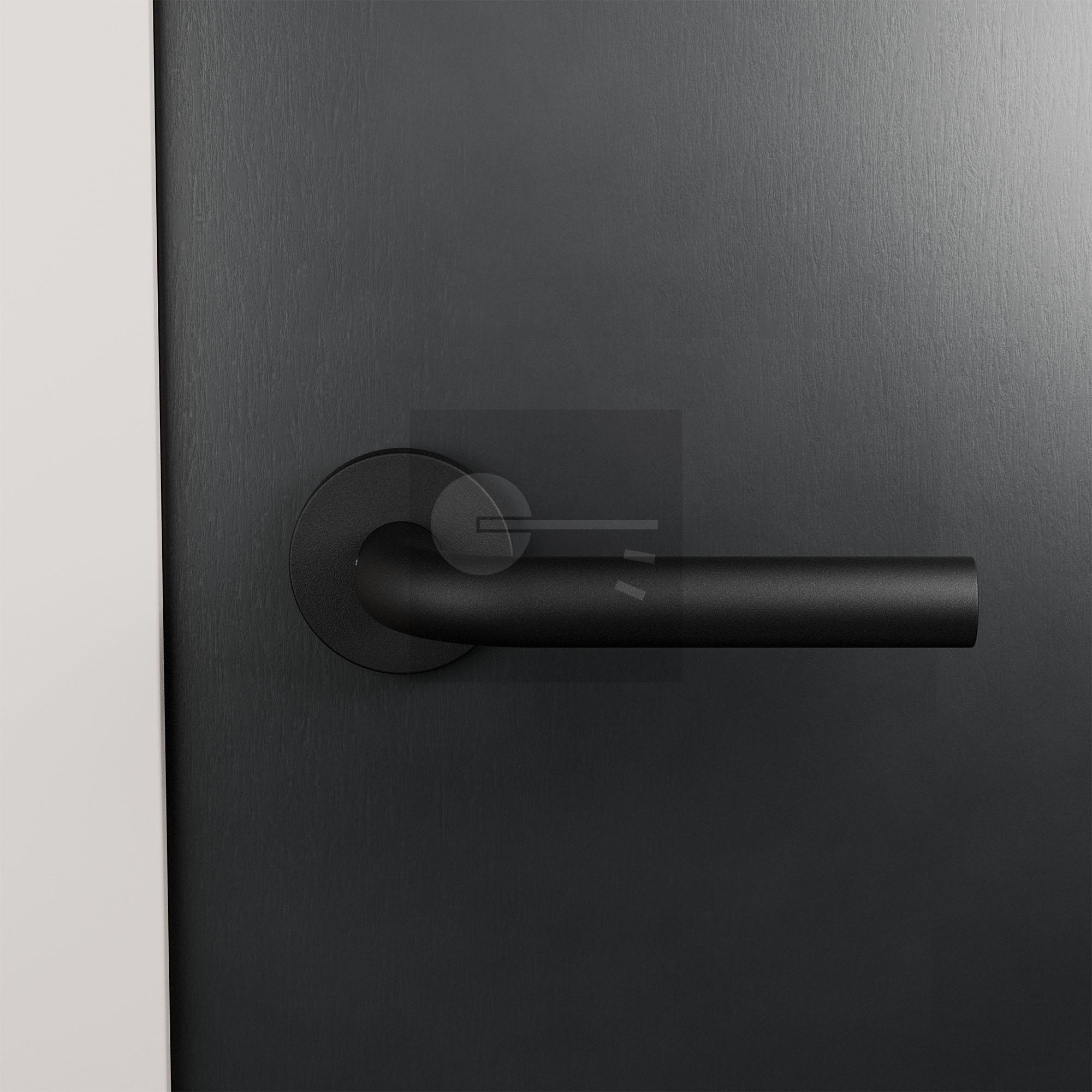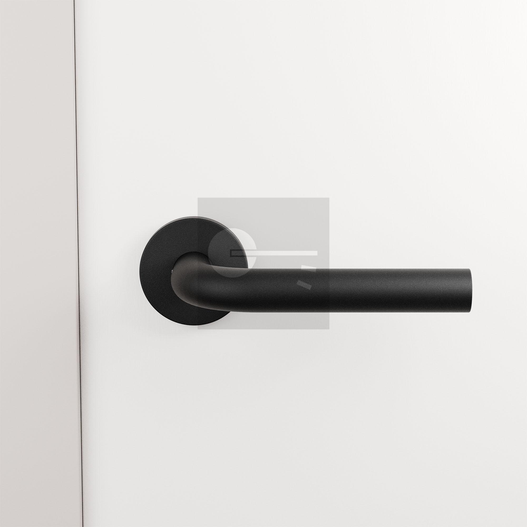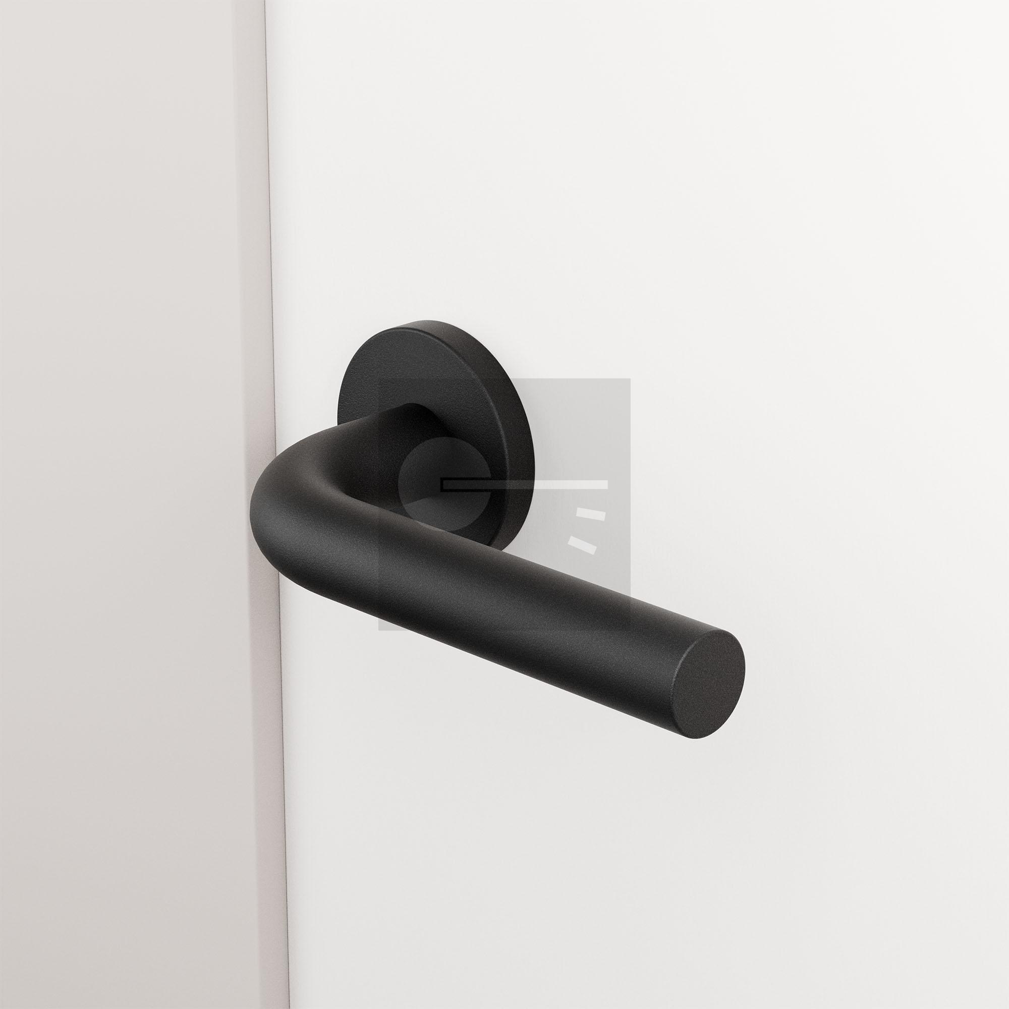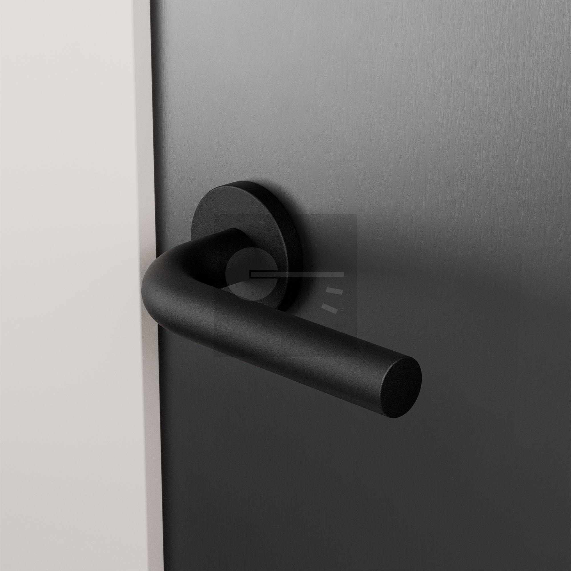 Zwarte deurkruk Aka op ronde rozet 50x8 mm, links-/ rechtswijzend.